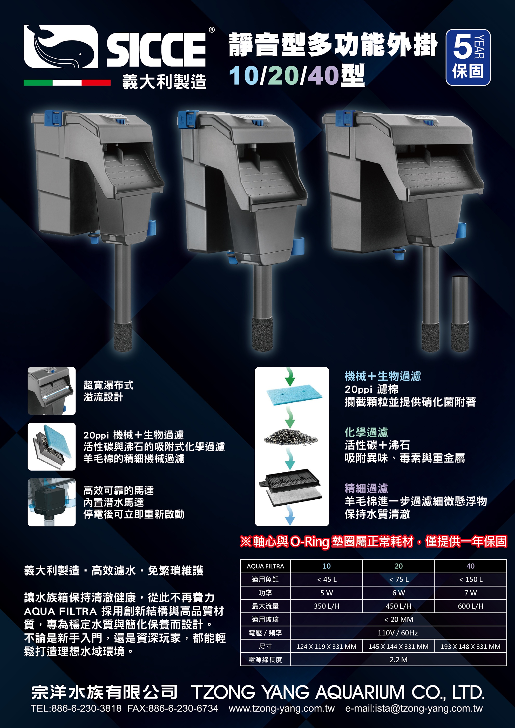 > 過濾設備,馬達 > 過濾器(內置、沉水) > 義大利 SICCE 希捷 ICCE Aqua Filtra 靜音型多功能外掛過濾器20 450L/H