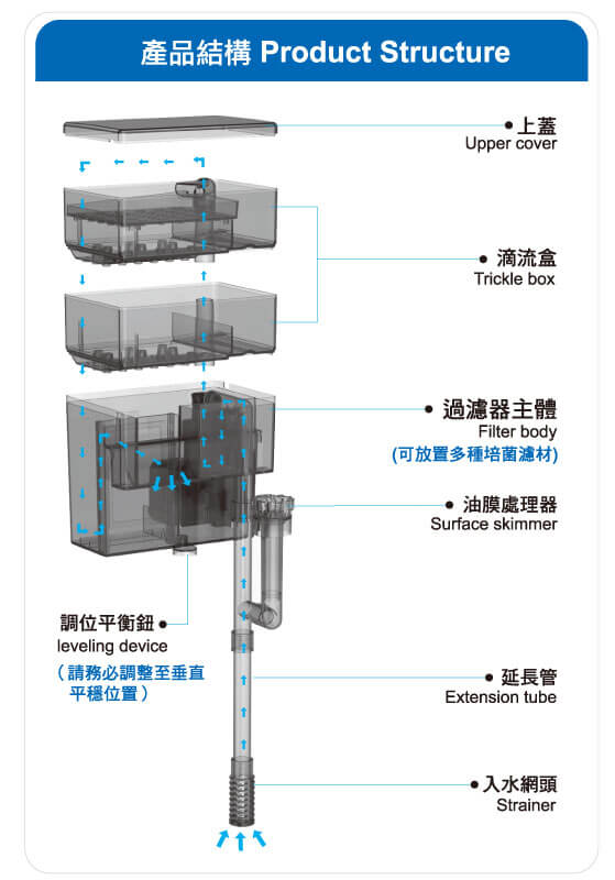 2.雙層滴流盒設計,可搭配多種濾材,乾溼分離過濾,