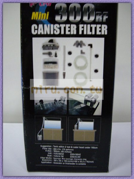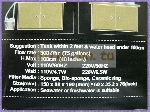 過濾器主體尺寸約長15*寬8.8*高19CM 流量300L/H,最大揚程100CM 電壓110V/60Hz--220V/50Hz 耗電量110V/4.7W--220V/6.5W 適用於100CM內高度,2尺以下魚缸 |