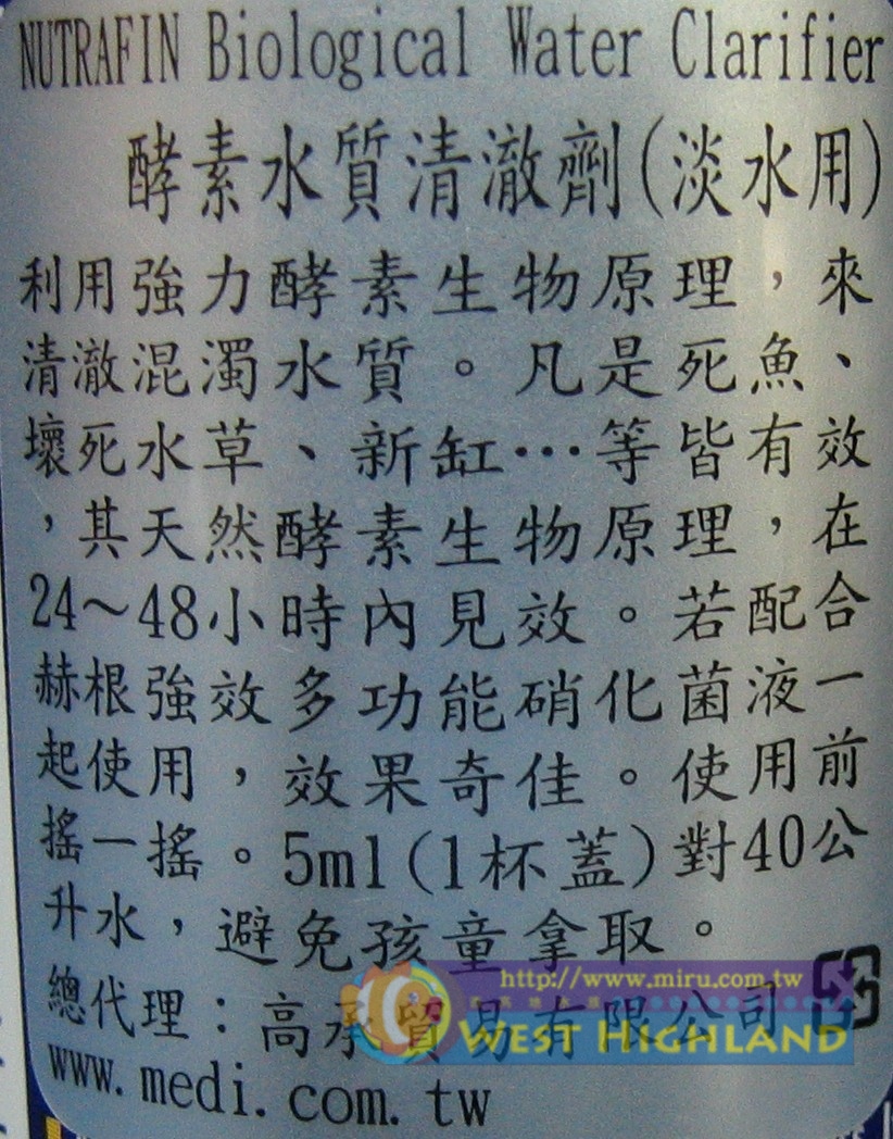 利用強力酵素生物原理,來清澈混濁水質。凡是死魚、壞死水草、新缸...等皆有效,期天然酵素生物原理,在24~48小時內見效。若配合赫根強效多功能消化菌液一起使用,效果奇佳。使用前搖一搖。5ml(1杯蓋)對40公升水,避免孩童拿取。 |