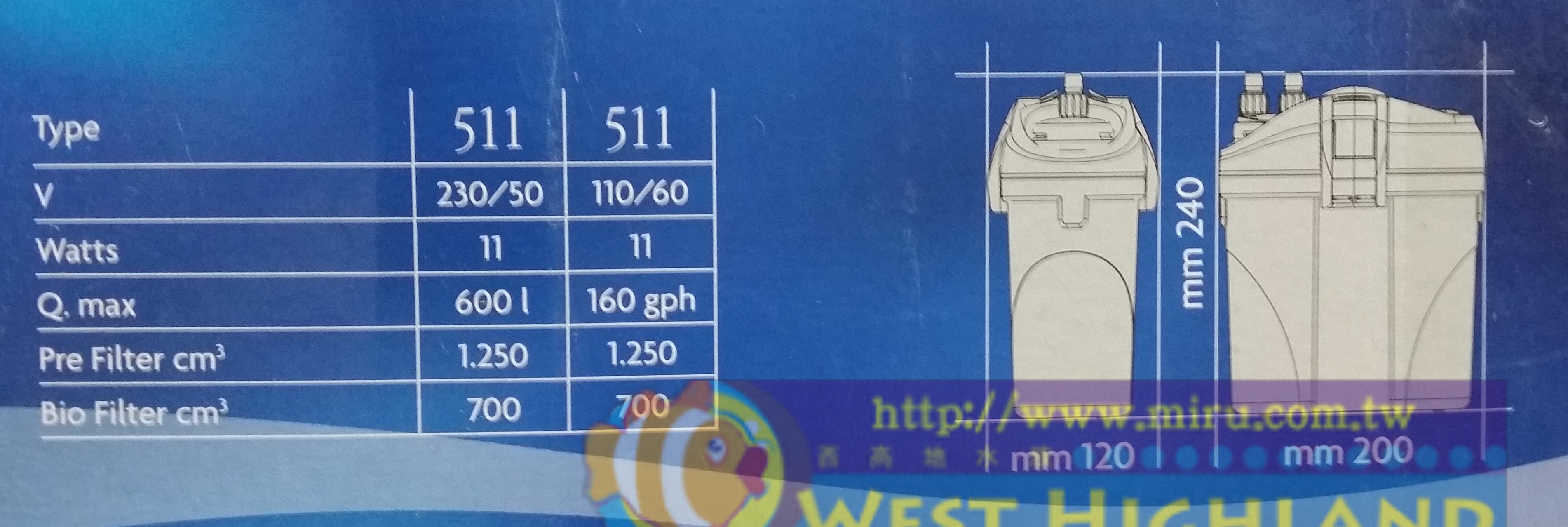 1. 流量:600L 2. 尺寸:20x12x24cm 3. 管徑:12/16mm 4. 瓦數:11w 送原廠濾材